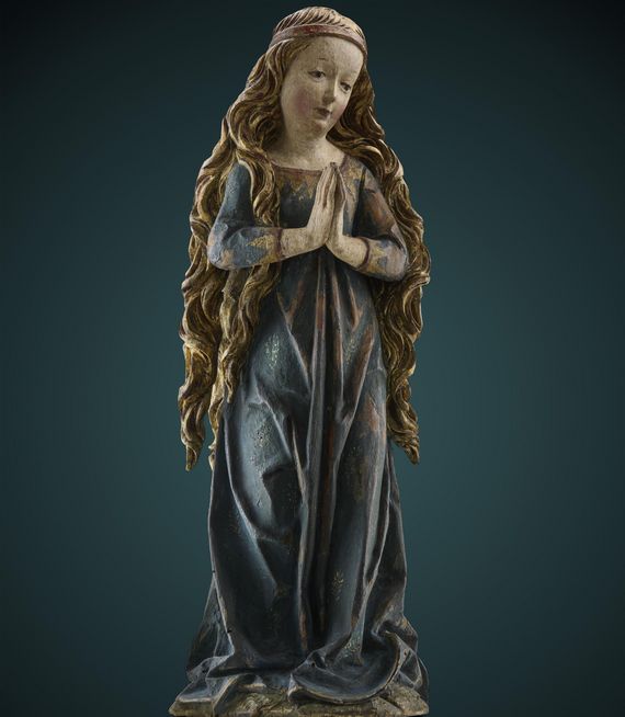 In the form of a young man with curly hair, dressed in armor and a long, flowing cloak, his right foot resting on a devilish creature with pointed ears and clawed hands. Walnut wood. H. 90 cm. - Wings and lance lost. - Remains of gilding on the lower mantle.