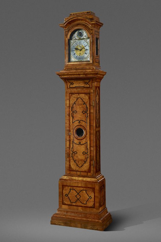 Veneered with walnut, birch, plum, and bog oak, and inlaid on all sides with strapwork. Rope movement with lever escapement on striking mechanism with two bells and date display.