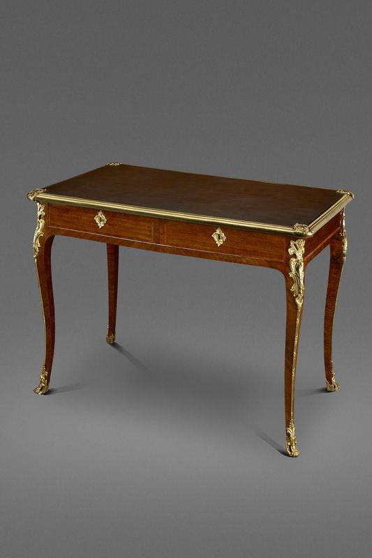 Elegant bureau with two drawers and fire-gilt bronzes, old leather writing surface.