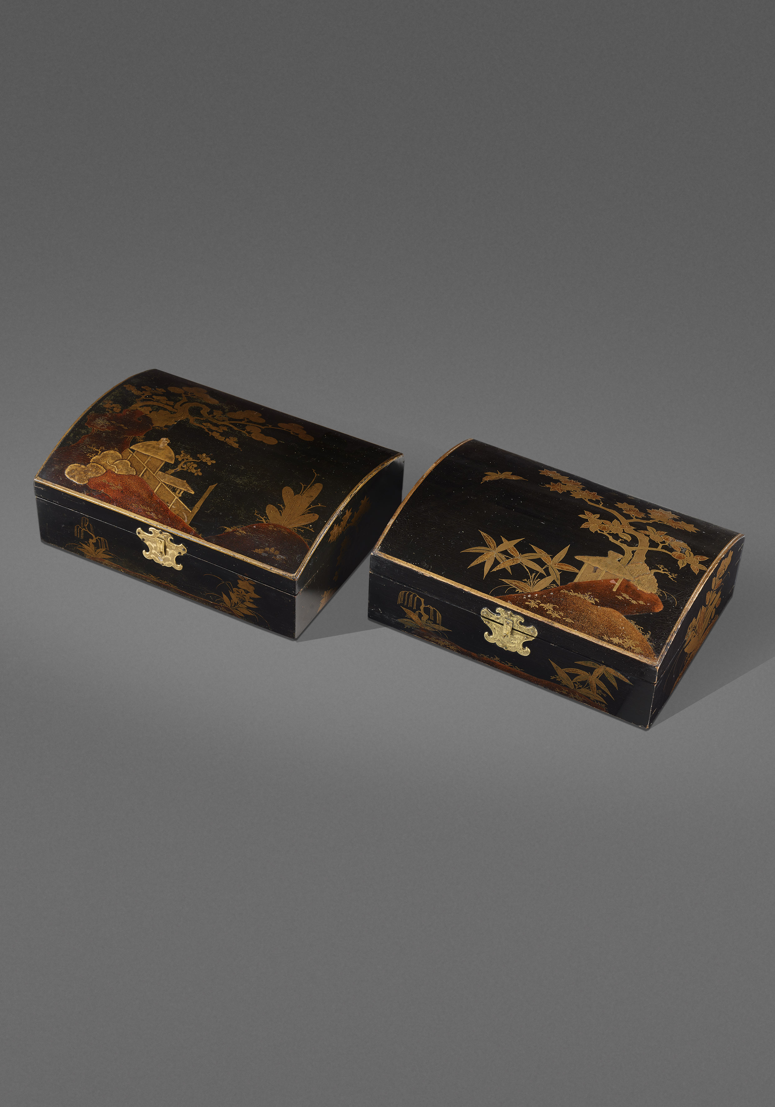 The pair of wig boxes is made in black lacquer and finely decorated in gold, partly sculptural, with East Asian architecture and vegetation.