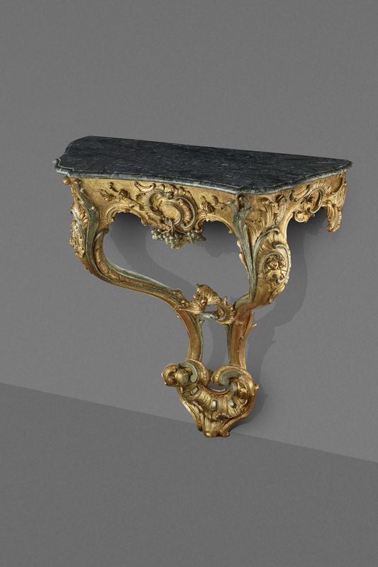 A comparable pair of corner console tables has been preserved in the Ansbach Residence.