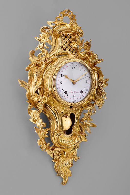 Fire-gilded bronze case with playful, asymmetrical Louis XV decoration made of finely divided, plastic and relief flower garlands, fine latticework with shell-shaped rocaille crowning and curved acanthus leaf ornaments. The white enamel dial with black, Arabic hour numerals and red minute track, finely sawn, gold-plated hands.