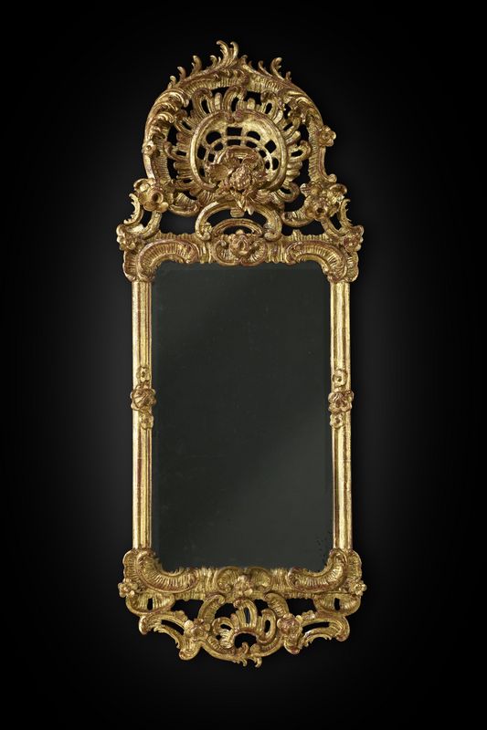 Elegant wall mirror, richly carved with original frame, gilding and faceted glass from the period.