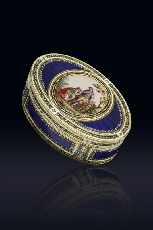 Oval gold box, Geneva hallmark around 1790, master's mark J. S. Magnin & Cie, yellow gold with translucent and opaque enamel and a flat body with hinged lid.
