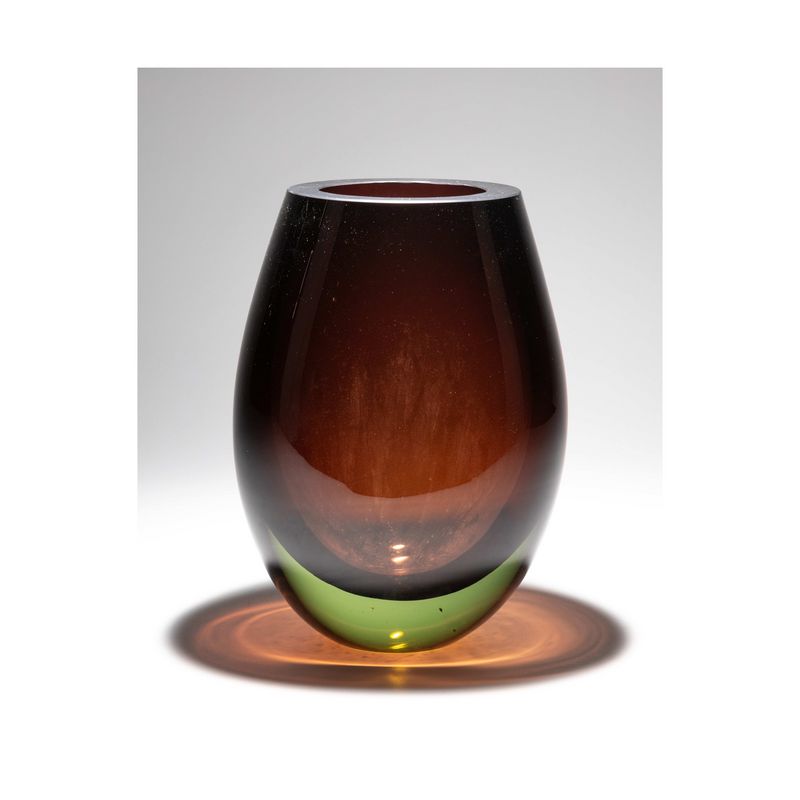 Ovoid shape. Thick-walled, slightly greenish glass with black-violet underlay. Signed on the base ''A.V. Seguso''. H. 28 cm.