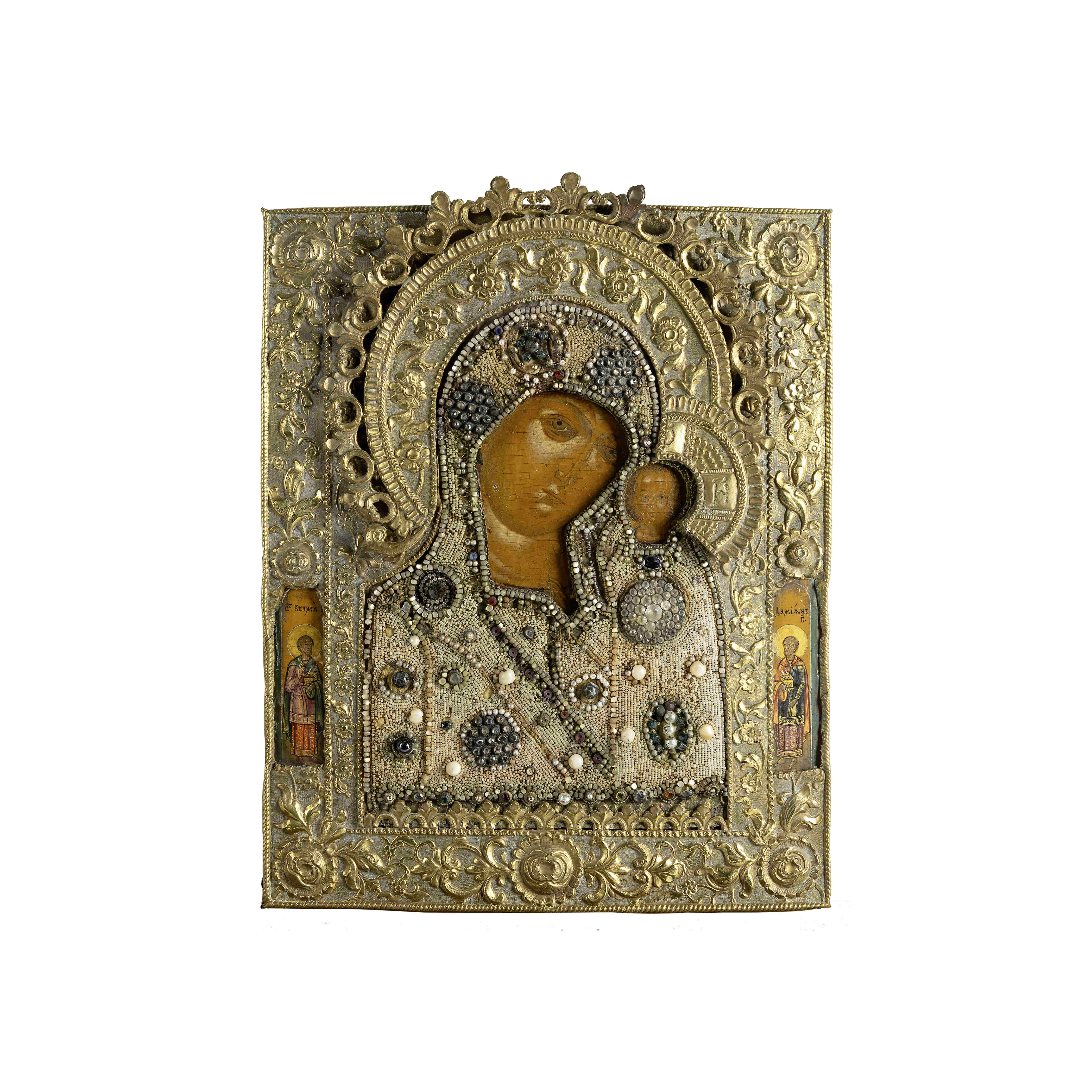 Altgläubigen-Ikone „Gottesmutter von Kasan“ in prachtvollem Oklad — Moskau, 19. Jh. — Begleitet von zwei Heiligen. Eitempera/Holz, Metalloklad mit hochgetriebenem Floraldekor sowie feine Perlenstickerei mit Glassteinen. 33 x 27 cm. - Kleinere Altersspuren.