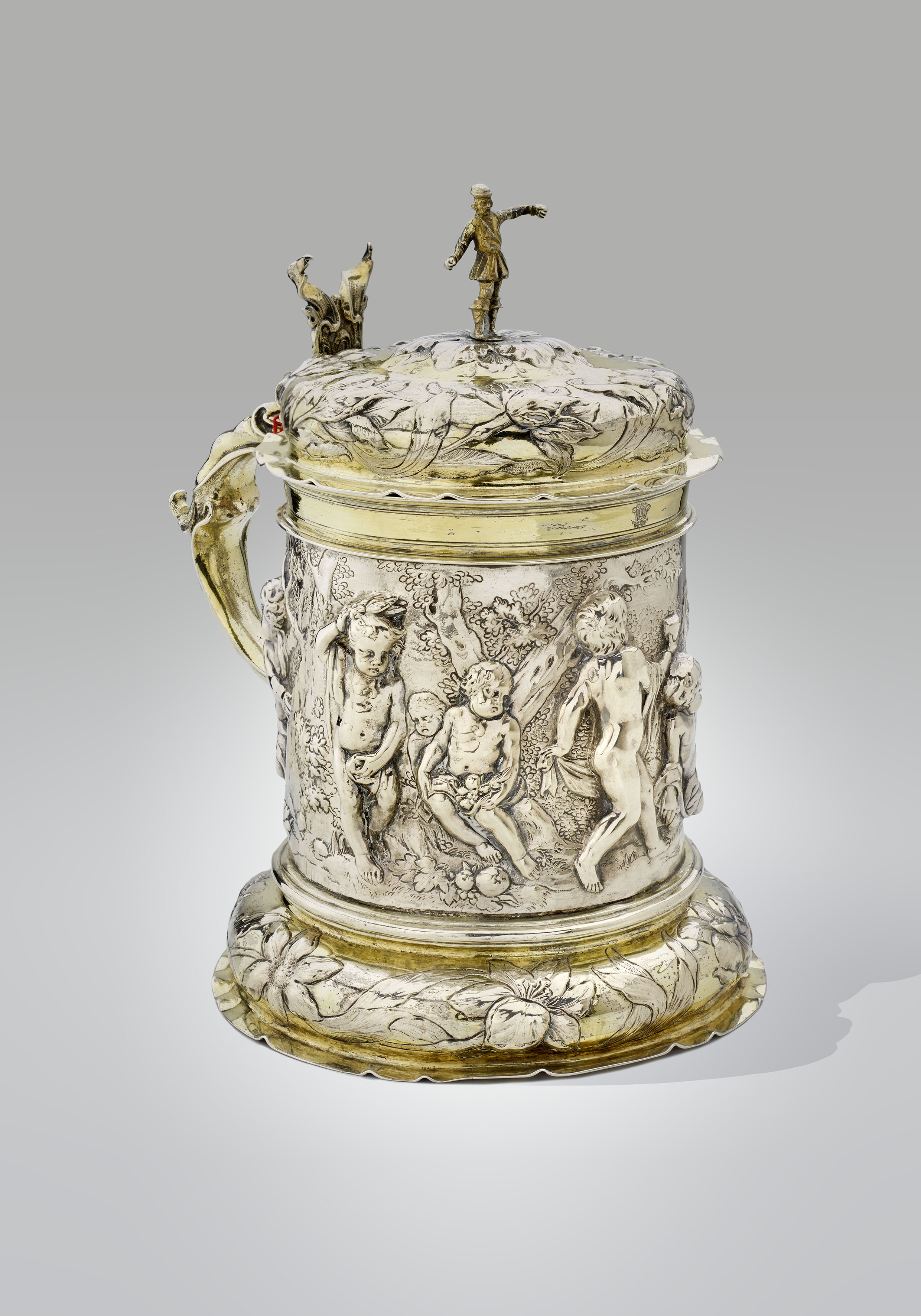 Auf der zylindrischen Wandung ein Reigen spielender Amoretten in Halbrelief getrieben, gerahmt von einem Fries naturalistischer Tulpen- und Narzissenblüten in Flachrelief auf dem Standwulst und dem Deckel, letzterer bekrönt von einer kleinen männlichen Figur (Weinschlauch und Traube verloren), der Griff in manieristischer Formensprache. Unter dem Lippenrand später gravierte Helmzier mit fünf Straußenfedern.