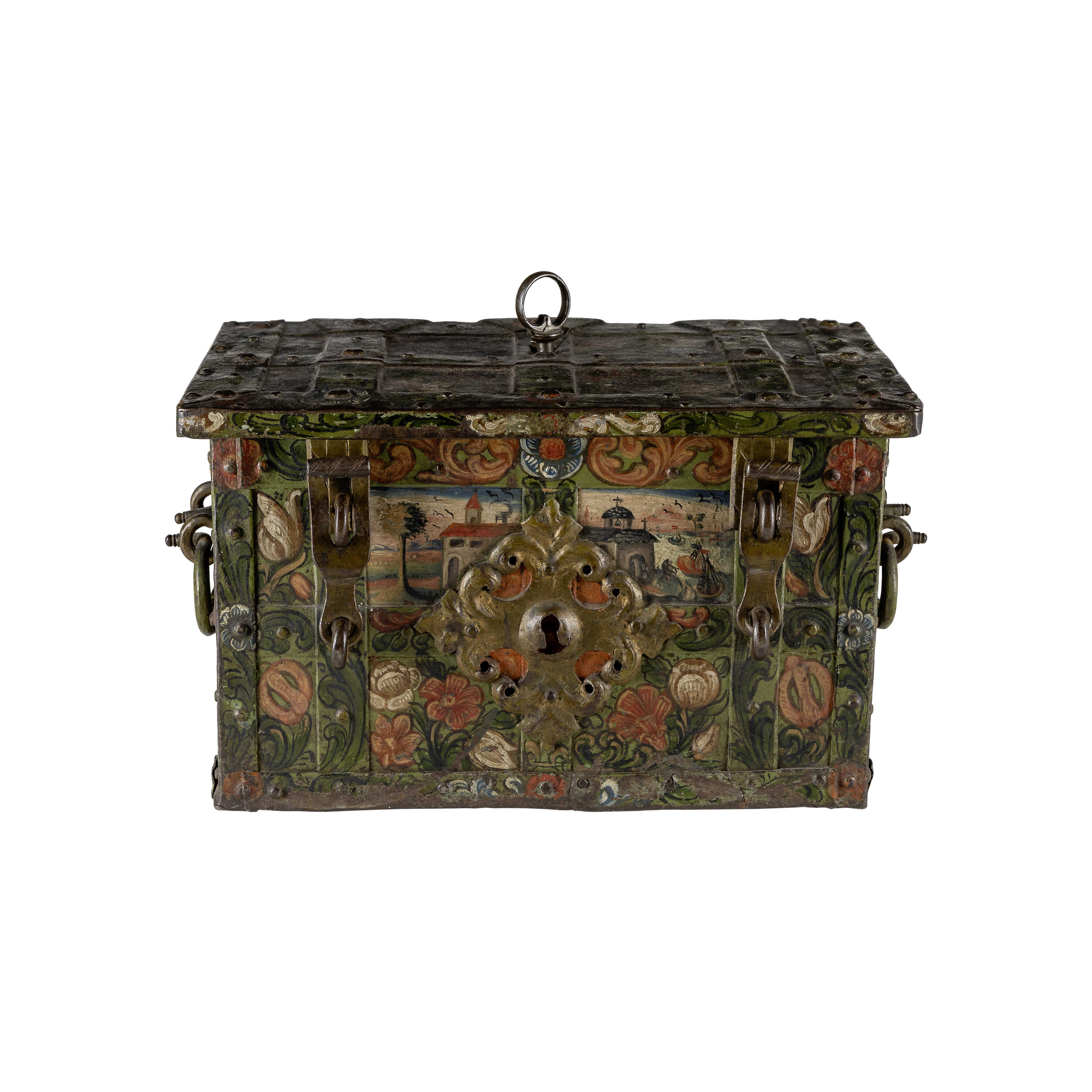 Bunt bemalte Barock-Eisentruhe — Wohl Nürnberg, 17. Jh. — Rechteckige Form mit zwei beweglichen Griffen und anscharniertem Deckel; genietete Eisenbänder, zwei Vorhängeschloss-Riegel sowie originaler Schlüssel für Stern-Vorhalterungen; farbige Außenfassung mit Blumen und Landschaft, die mit Rankenwerk gravierte und gebläute Schlossplatte mit Darstellung eines Baders mit Rasiermesser sowie eines Mediziners mit Uringlas und Klistier, inwendig rot gefasst. 19,5 x 33,5 x 20,5 cm. - Schlüssel dabei.