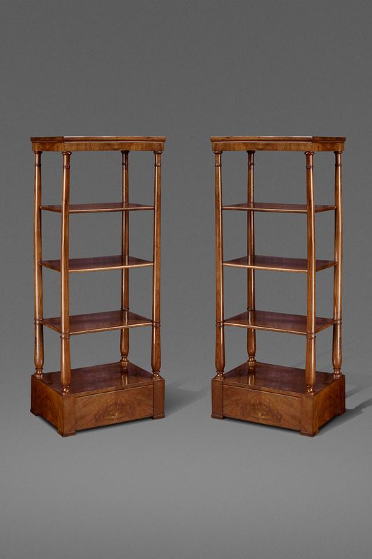 Nussbaum, massiv und furniert, mit Schüben in den Sockeln.
