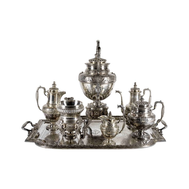 Exzeptionelles, siebenteiliges Service — Paris, Odiot - 19. Jh. — Samowar auf Rechaud (H. 55 cm), Kaffeekanne (H. 30 cm), Heißwasserkanne (H. 30 cm), Teekanne (H. 24 cm), Sahnegießer (H. 17,5 cm), zweiteiliges Wärmegefäß mit Rechaud (H. 22 cm), Tablett (87 x 54 cm). Reliefdekor aus Ornamentborten mit Godronen und Akanthusranken, Rechauds auf Ball- und Klauenfüßen mit Akanthusblattansatz, Medaillons mit Monogrammgravur. Silber. Unterseitig Stempel Herstellersignet und Namenszug "Odiot a Paris", Modellnummern u.a. 1776, 1777, 1778, 1780, 1814, seitlich behelmter Minervakopf für Feingehalt 950. Gewicht brutto 20.400 g.