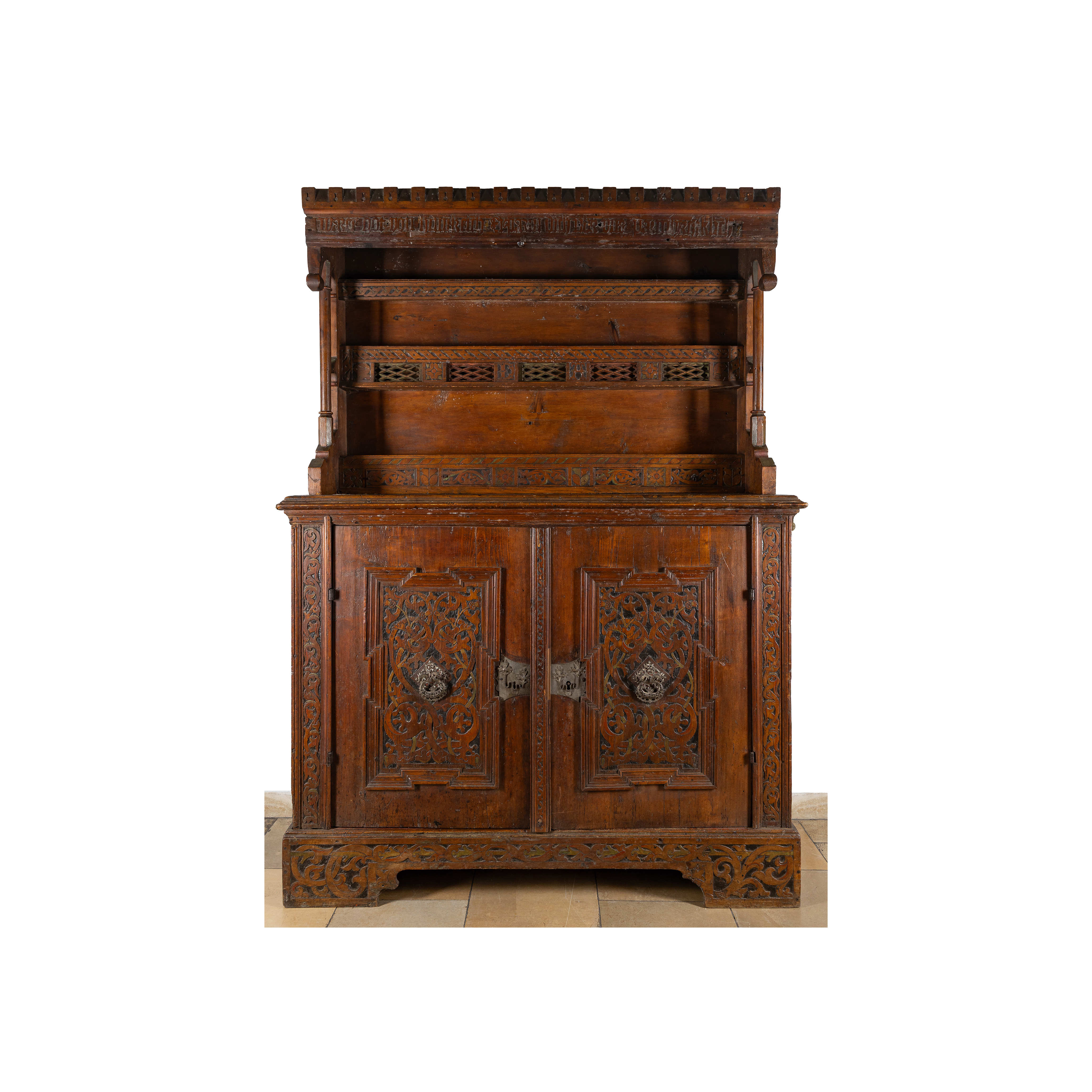 Gotisches Buffet — Alpenländisch, um 1500 — Über truhenartigem, zweitürigem Schrankteil mit Schnitzornamenten, rückspringendes, offenes Fach mit verschiebbarem, durchbrochenem Gitterwerk, Einlage von zwei Säulen flankiert, abschließender Zinnenkranz mit Schnitzerei und unleserlicher, gotischer Inschrift, im Zwischenfach monogrammiert DA. Nadelholz. Ca. 235 x 163 x 53 cm. - Altersspuren.
