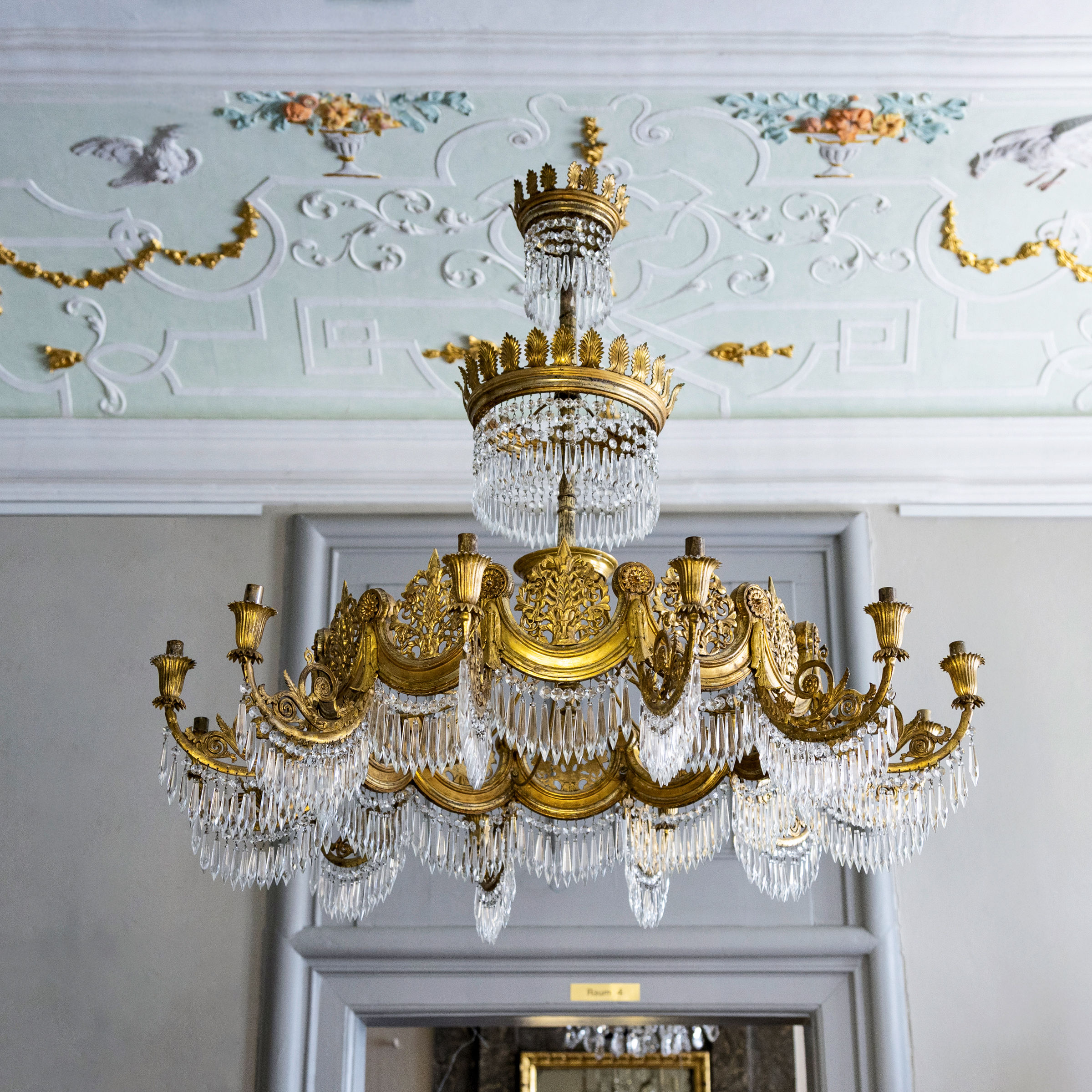 Große Reifenkrone - Entwurf Karl Friedrich Schinkel — Neoklassizistisch, Berlin um 1835 — Großer aus geschwungenen Elementen gebildeter Reif mit 12 Leuchterarmen, reich geziert mit Schnitzereien aus durchbrochenem Blattwerk, Rosetten und Akanthusranken, an bogenförmigen Stäben am Mittelschaft aufgehängt, als oberer Abschluss zwei konzentrische Kronen. Holz und Metall vergoldet, Prismenbehang. H. ca. 105 cm, Ø ca. 112 cm. - Die Ausführung des Leuchters Kunstschreiner Claus August Mencke und Schwitzky zugeschrieben, einer bekannten Manufaktur in Berlin. Vergleichbare Stücke von 1830 befinden sich in Berlin im Knoblauchhaus sowie in Schloss Glienicke Casino Saal sowie Roter Saal, Lit. Gert Streidt / Klaus Frahm: Potsdam: Schlösser und Gärten der Hohenzollern. - Von sehr guter Erhaltung, aus bedeutender Privatsammlung.