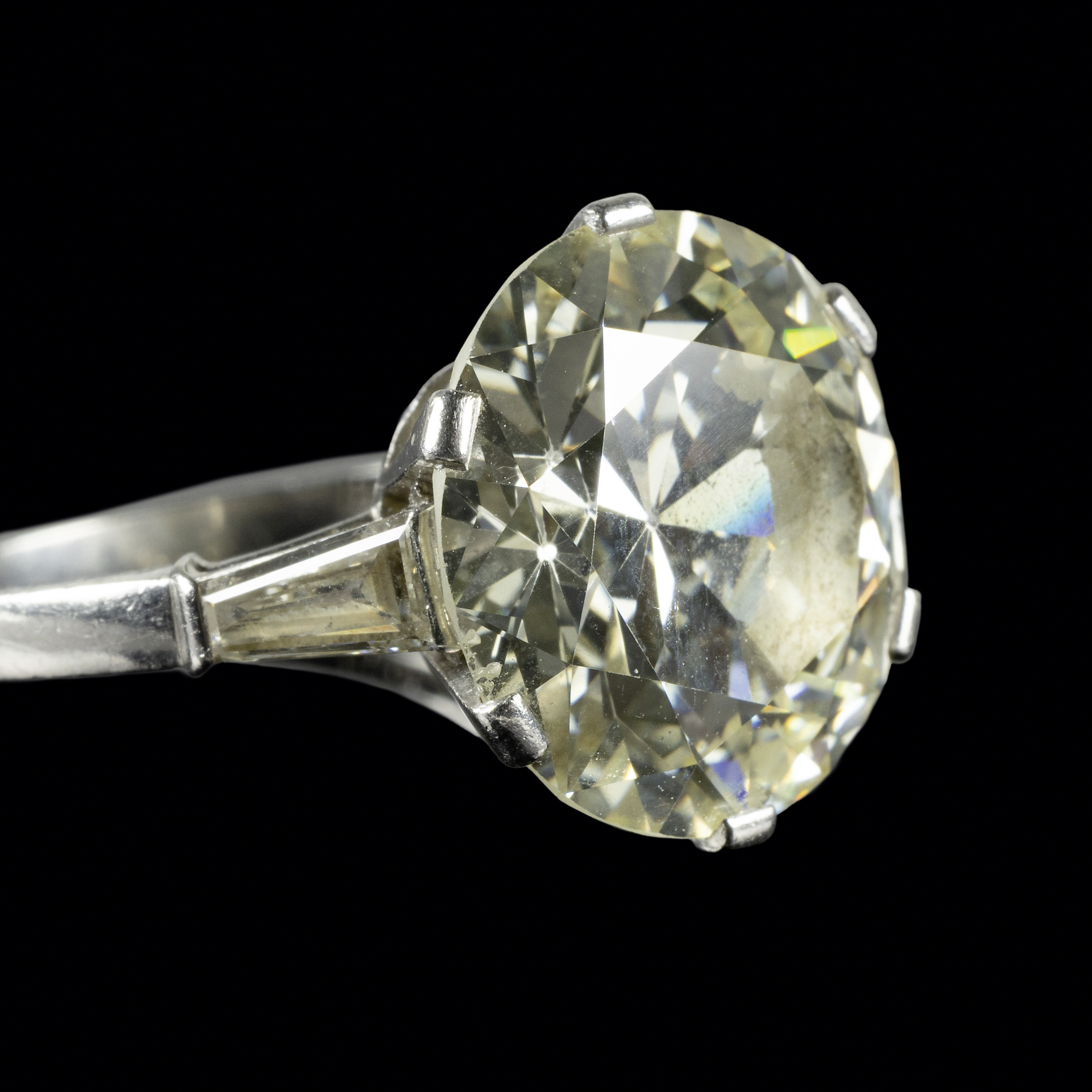 Imposanter Solitärring mit Brillant von ca. 9,74 ct — Bulgari, neuzeitlich — Von sechs Krappen gefasster Diamant im Übergangsschliff von ca. 9,74 ct (Reinheit VS1, Farbe im Bereich J, getöntes Weiß), die schlanke Schiene an den erhöhten Schultern mit zwei trapezförmig facettierten Diamanten besetzt von zus. ca. 0,20 ct. Platin. Gestempelt mit „Bvlgari". Ringgröße 51, 6 g. - Klassisch-elegante und hochwertige Ausführung. - Aktuelles Gutachten der Deutschen Gesellschaft für Edelsteinbewertung (DeGEB) liegt vor. Der Wiederbeschaffungswert liegt laut Gutachten bei 180.000 Euro.