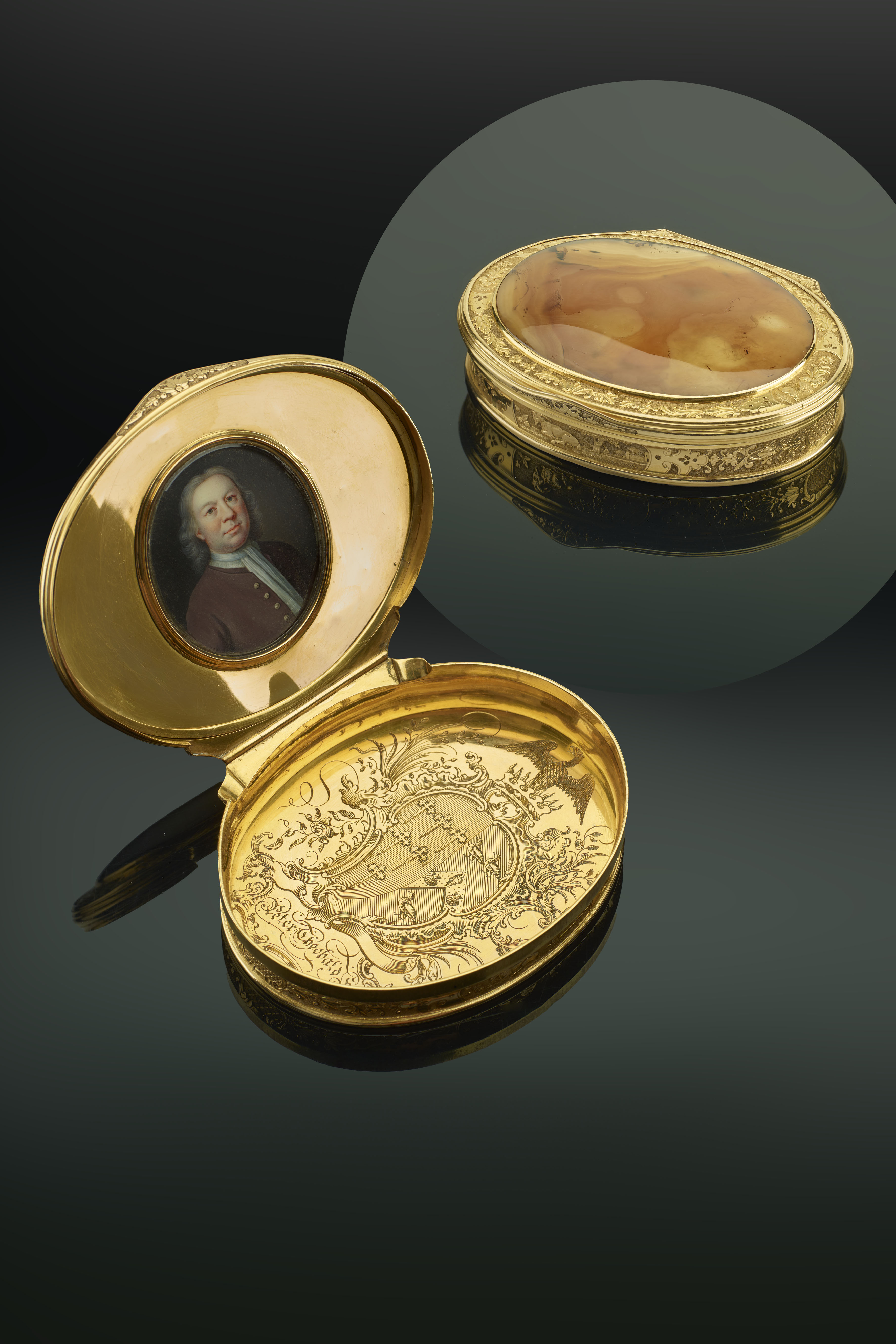 Im Deckel innen eingelassen Miniaturporträt des Peter Theobald, Esquire, sowie im Boden Gravur des bekrönten Wappens des Dargestellten, datiert 1740, Georg II., London um 1740